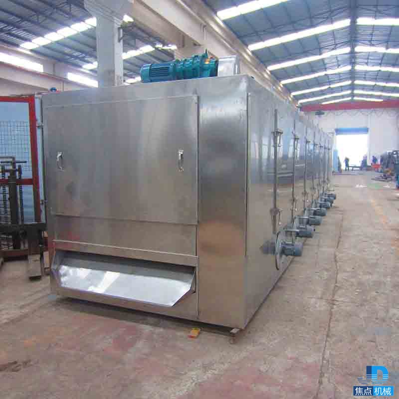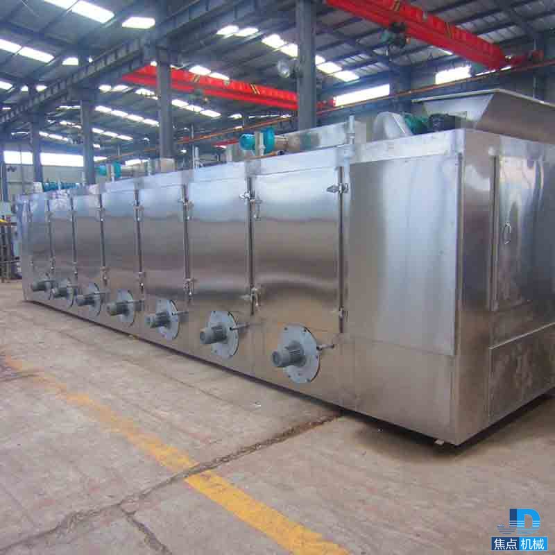 物料由加料器均勻地鋪在網(wǎng)帶上,網(wǎng)帶一般采用12-60目不銹鋼絲網(wǎng),由傳動裝置拖動在干燥機內(nèi)移動。干燥機由若干單元組成,每一單元熱風獨立循環(huán),部分尾氣由專門排濕風機排出,廢氣由調(diào)節(jié)閥控制,熱氣由下往上或由上往下穿過鋪滿物料的網(wǎng)帶完成熱量與質(zhì)量傳遞的進程,帶走物料水份。網(wǎng)帶緩慢移動,運行速度可根據(jù)物料溫度自由調(diào)節(jié),干燥后的成品連續(xù)落入收料器中。上下循環(huán)單元根據(jù)用戶需要可靈活配備,單元數(shù)量亦可根據(jù)需要選取。
