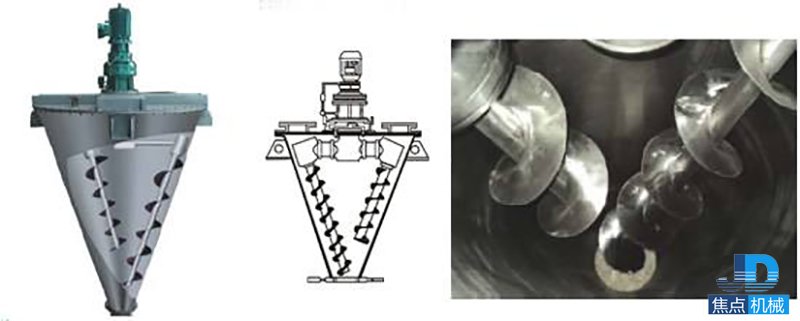 DSH系列的錐形混合機(jī)筒內(nèi)兩只非對稱螺旋自轉(zhuǎn)將物料向上提升,轉(zhuǎn)臂慢速公轉(zhuǎn)運(yùn)動(dòng);使螺旋外的物料,不同程度進(jìn)入螺柱,從而達(dá)到全圓周方位物料的不斷更新擴(kuò)散,被提到上部的兩股物料再向中心凹穴匯合,形成一股向下的物料流,補(bǔ)充了底部的空缺,從而形成對流循環(huán)的三重混合效果;標(biāo)準(zhǔn)型錐形螺旋混合機(jī)有兩根攪拌螺旋,實(shí)際應(yīng)用中根據(jù)設(shè)備規(guī)格大小可以采用單(一根長螺旋)、雙(長短各一兩根不對稱螺旋)、三(兩短一長對稱布置)根螺旋;理論上攪拌螺旋越多,混合效果越好;設(shè)備一般采用梅花狀“錯(cuò)位閥”,此閥與長螺旋底部貼合緊密,有效減少混合死角,驅(qū)動(dòng)形式有手動(dòng)和氣動(dòng)可選;根據(jù)用戶需要,也可加裝蝶閥、球閥、星形卸料器、邊出料等。