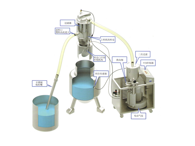 電動真空加料機(jī)由電動氣泵產(chǎn)生真空即負(fù)壓,這樣真空加料機(jī)將通過輸料管從儲料倉中將物料吸入上料機(jī)料倉內(nèi),再經(jīng)過過濾器將氣物分離,上料時間由PCB控制器決定,吸料結(jié)束,氣動開閉機(jī)構(gòu)將料倉門打開將物料放入相關(guān)的設(shè)備中,反吹裝置將反吹吸附在過濾器上的粉末,將粉末清除掉,然后再關(guān)閉料倉門,下一個循環(huán)開始。